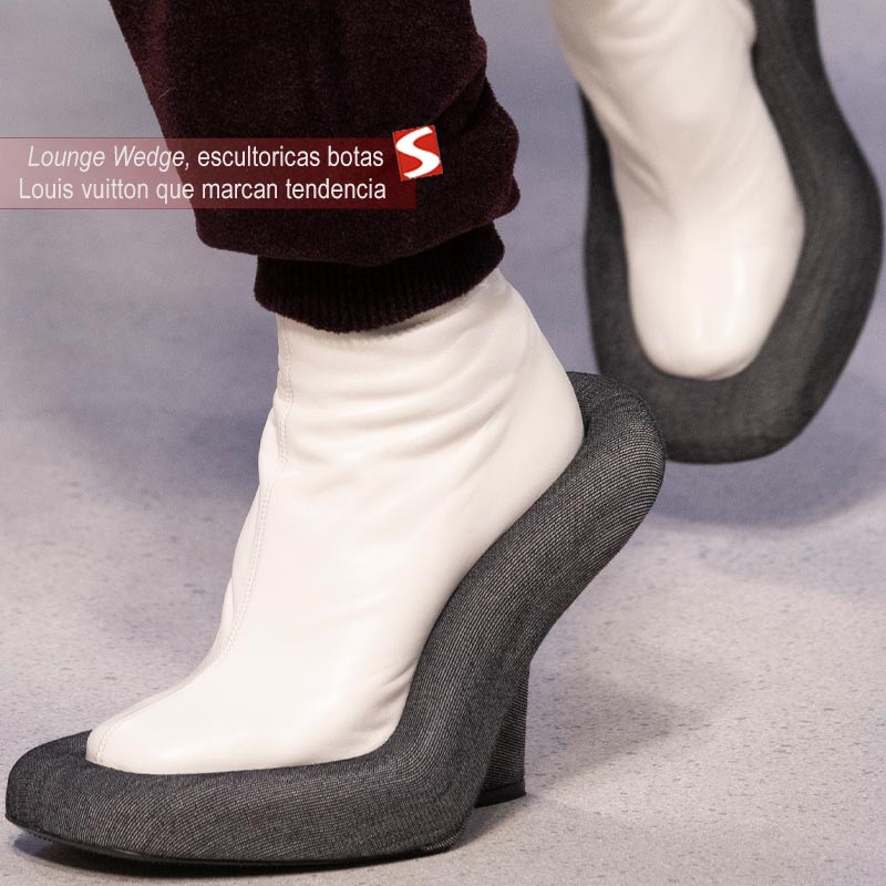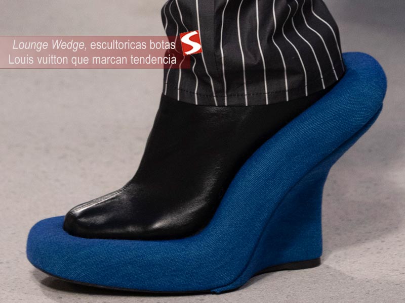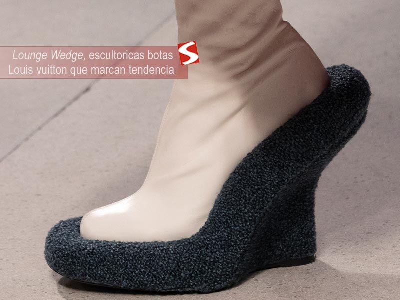 Además, cuenta con una suela de rodadura cuero que complementa la calidad artesanal típica de Louis Vuitton. Las escultóricas botas Lounge Wedge representan una fusión entre arte, moda y mobiliario avant-garde diseñadas para destacar en cualquier look femenino. La marca ha desarrollado estas botas tanto en versiones de alto diseño como una versión comercial monocolor donde la escultórica sula sobredimensionada es menor y viene forrada en cuero creando un estilo monocromático.